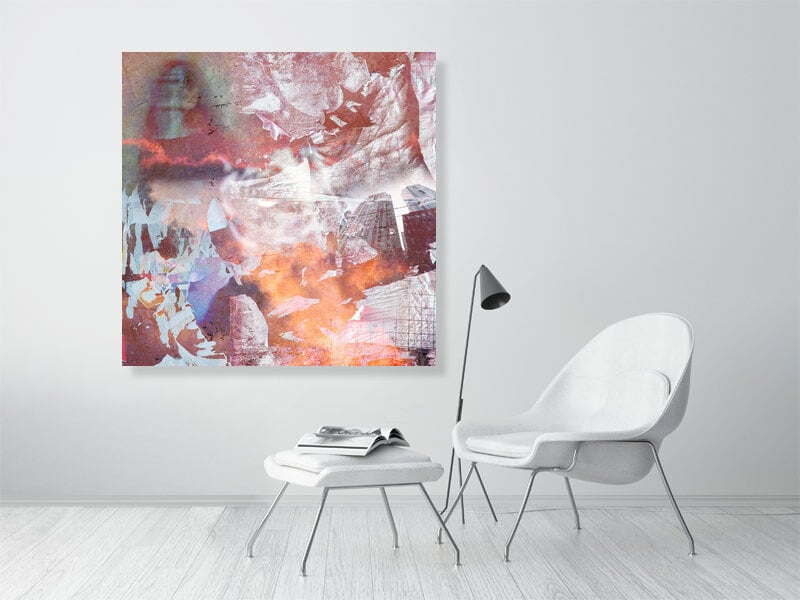 Fragments of city, sky, memory and form are layered until distinction softens, with foreground and background exchanging roles. The surface appears weathered, almost eroded, as if time itself has passed through the image and left traces behind. Nothing here is singular. Everything overlaps.